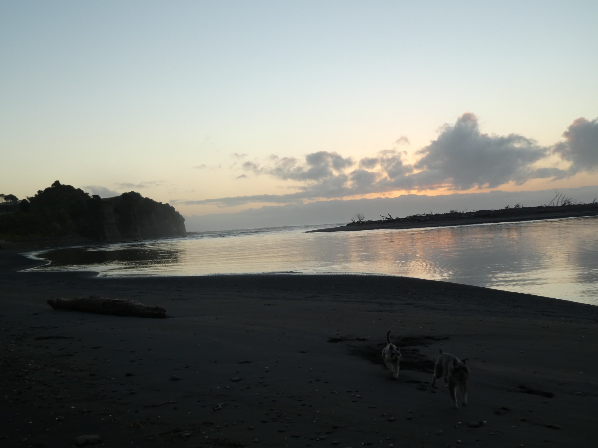 It was just on sun down so we took the dogs for a short walk over the dunes to the Mokau river mouth. The water was still, and we would see the ripples from little fish. It was a shame we did not come to the beach with our fishing rods! Still, we had a walk around and enjoyed the views of the sun setting across the river mouth.