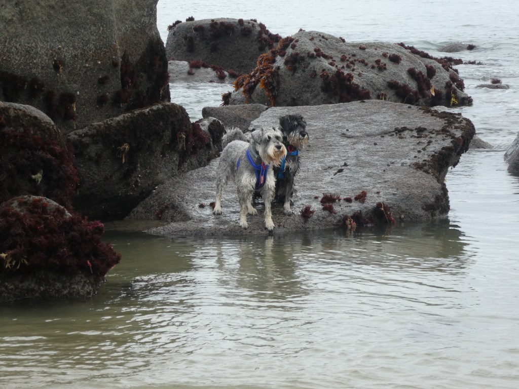 We took the boys for a walk on the beach before low tide and they enjoyed having a run and a play around. We took them up to the rocks at the base of Monkey Island and Beau had a go at walking on water, only to find he couldn’t and had to swim for it. Hunter, in the meantime went rock hopping and when it came time to come back he was reluctant as the waves had cut the rock off, and he might have had to get wet! Of course, whatever Hunter does, Beau has to do as well.