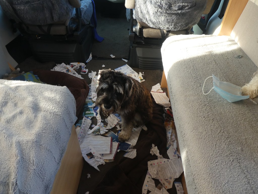 Before heading to Waimate though, we took the dogs for a beach walk at Caroline Bay, and paid a visit to the South Canterbury Museum. While we were there Beau decided to have a look for himself for another Park Over Property, and the evidence of this was throughout the van.