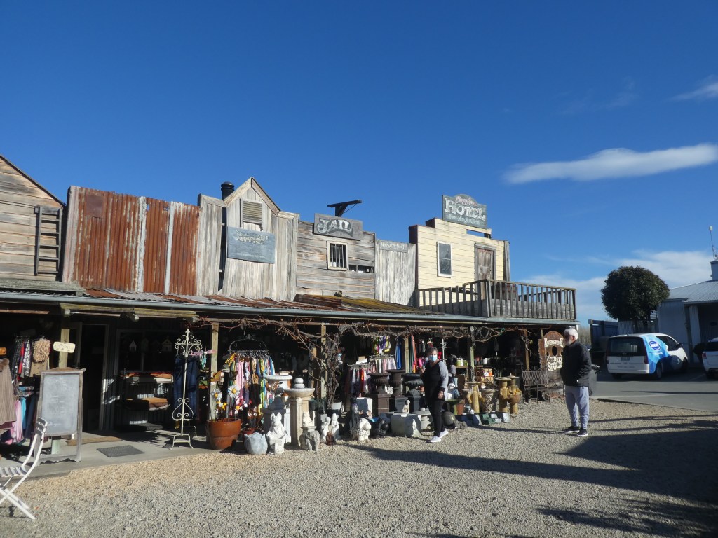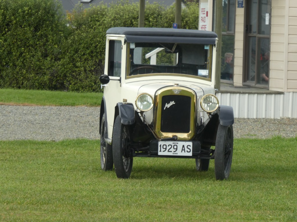 Early the next morning we were woken to the sound of thundering hooves. The nose of the motorhome wasn’t far from the railings so Bruce and Beau watched out the windscreen to the horses galloping by. Beau was not a happy camper! He seemed to thinks that each time they came around the track they were coming to get him, and it took him a couple of days to calm down. We were both a bit surprised by this and it was an easy decision to spend the next night at the NZMCA Park at Waimate. No horses here, only this old buggy!