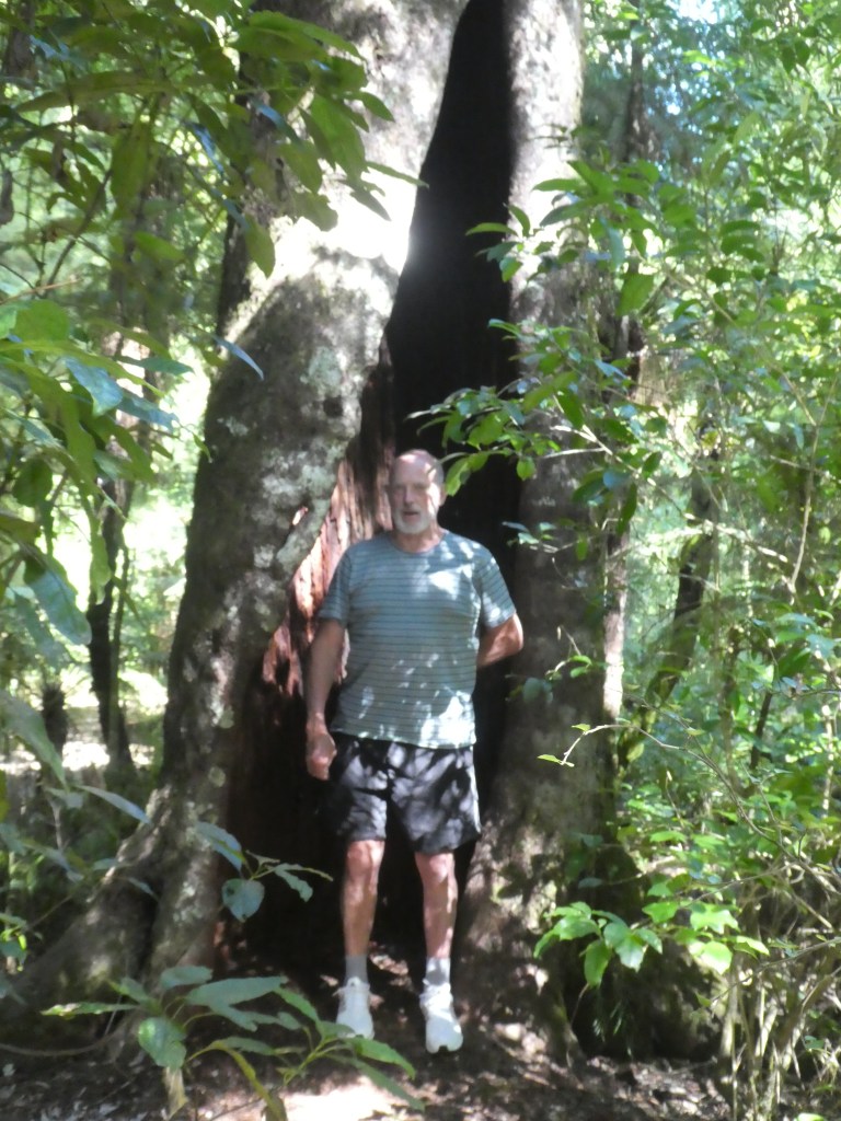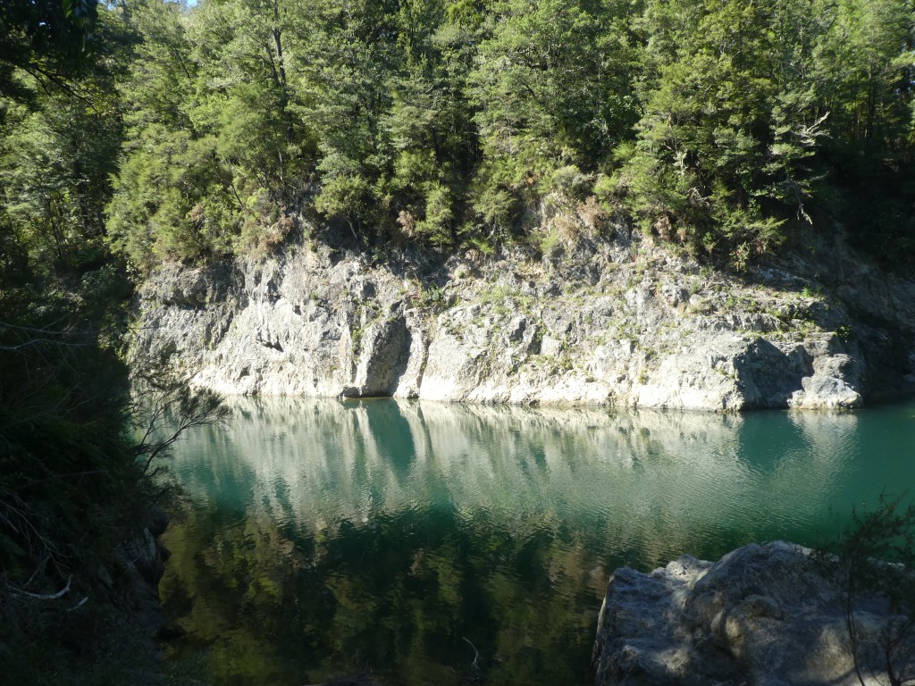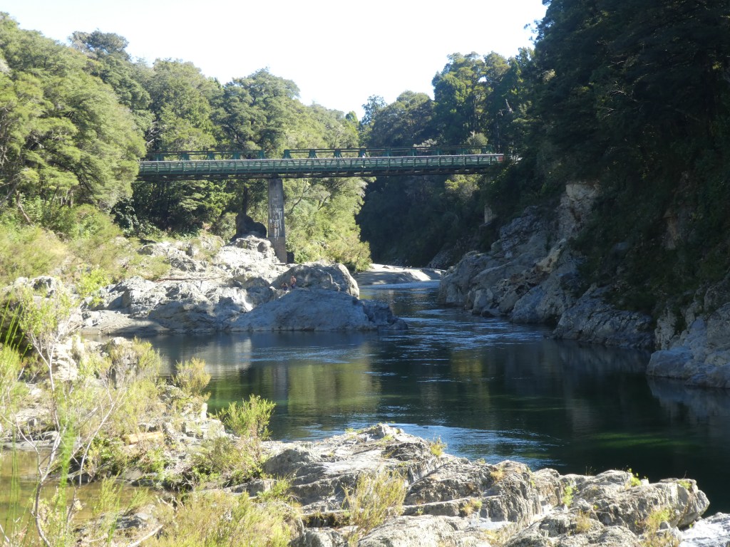 On the way to Motueka we decided to take a lunch break at a place called Pelorus Bridge. It had extensive parking areas (in the shade for Bruce’s benefit), with several walks through bush. We decided to stroll through the “Totara” bush walk.