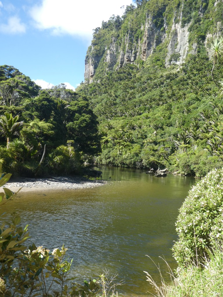 The road south heads inland for a while, and we enjoyed our views of the inland rocky rivers. We stopped to explore a little at the Paparoa Scenic Reserve, which included walking along some of the narrow, outside edge of a bridge to get the perfect shot.