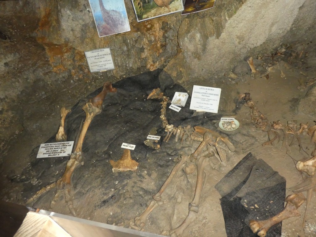 The temperature underground is a chilly 11 degrees, all year around, and there is next to zero humidity. Apparently, if you hung wet washing out in the caves it would take many years to dry. We were also told that you don’t feel and earthquake if you are in the cave, which I thought defied logic. The paths were narrow, and the cave itself featured 18 full moa skeletons (the smaller bush moa). Apparently the government has removed most but left a couple of skeletons for exhibition. It seems the moa fell down a tomo and either froze or starved to death.