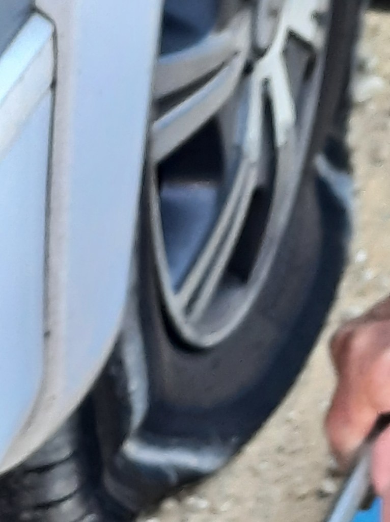 We found the road, although we initially went past it, and had to find a driveway that we could use to turn around in. We were only about 20m down the road when the motorhome started making a terrible noise. I got out, had a look, and found we had a VERY flat back tyre – our first ever puncture! Bruce had no choice but to keep driving about 50m to find a big enough driveway where he could pull off the narrow metal road.