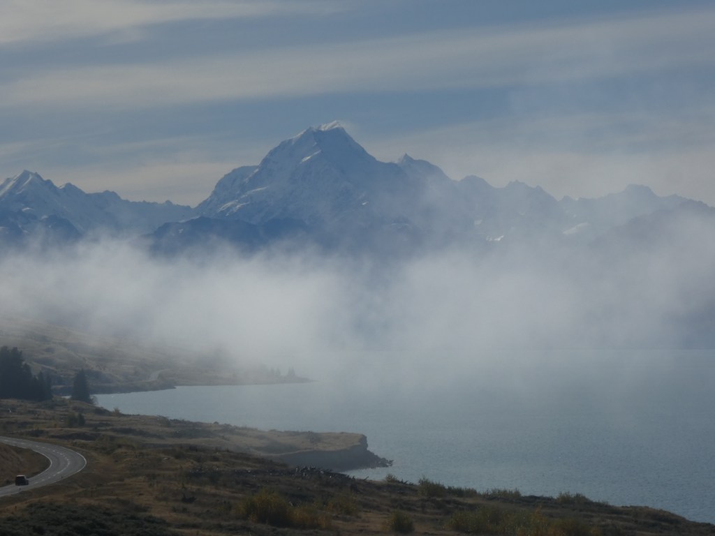 I had told Bruce that if the fog lifted, I would like to go back to Mt Cook. I never cease to be awed by it’s majesty. As we were nearing Lake Pupuke, the fog was starting to lift, but it was still very hazy.