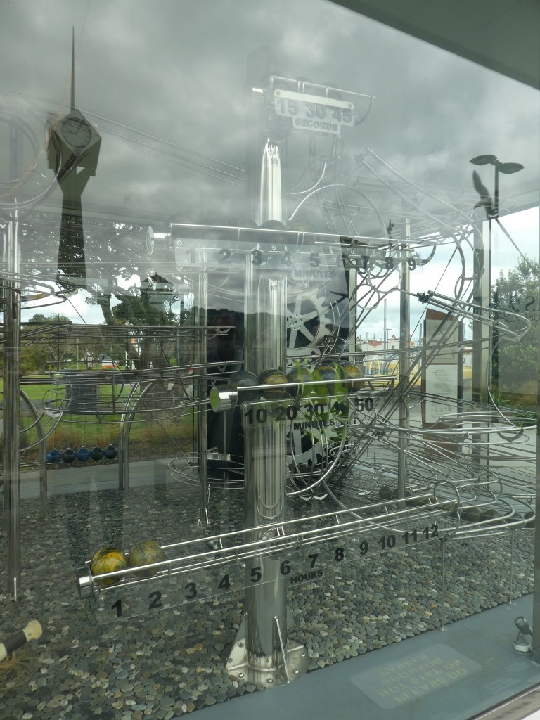 As she (I call it a her because she carried a handbag) cycled away her momentum pushed balls around the clock, dropping 4 balls per minute into the tray that told you what the time was.