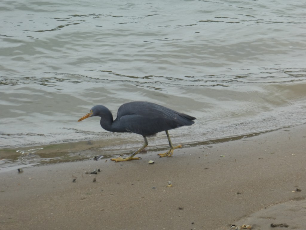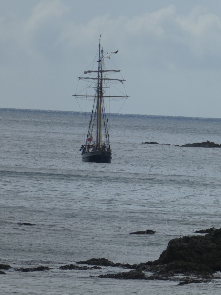 The beach was deserted – a wide expanse of soft, but coarse sand. At the mouth of the estuary was a rocky point and just beyond it we could see a tall ship at anchor. We couldn’t tell what bay it was off, or how you might get closer to it so we had to be content with distant views.