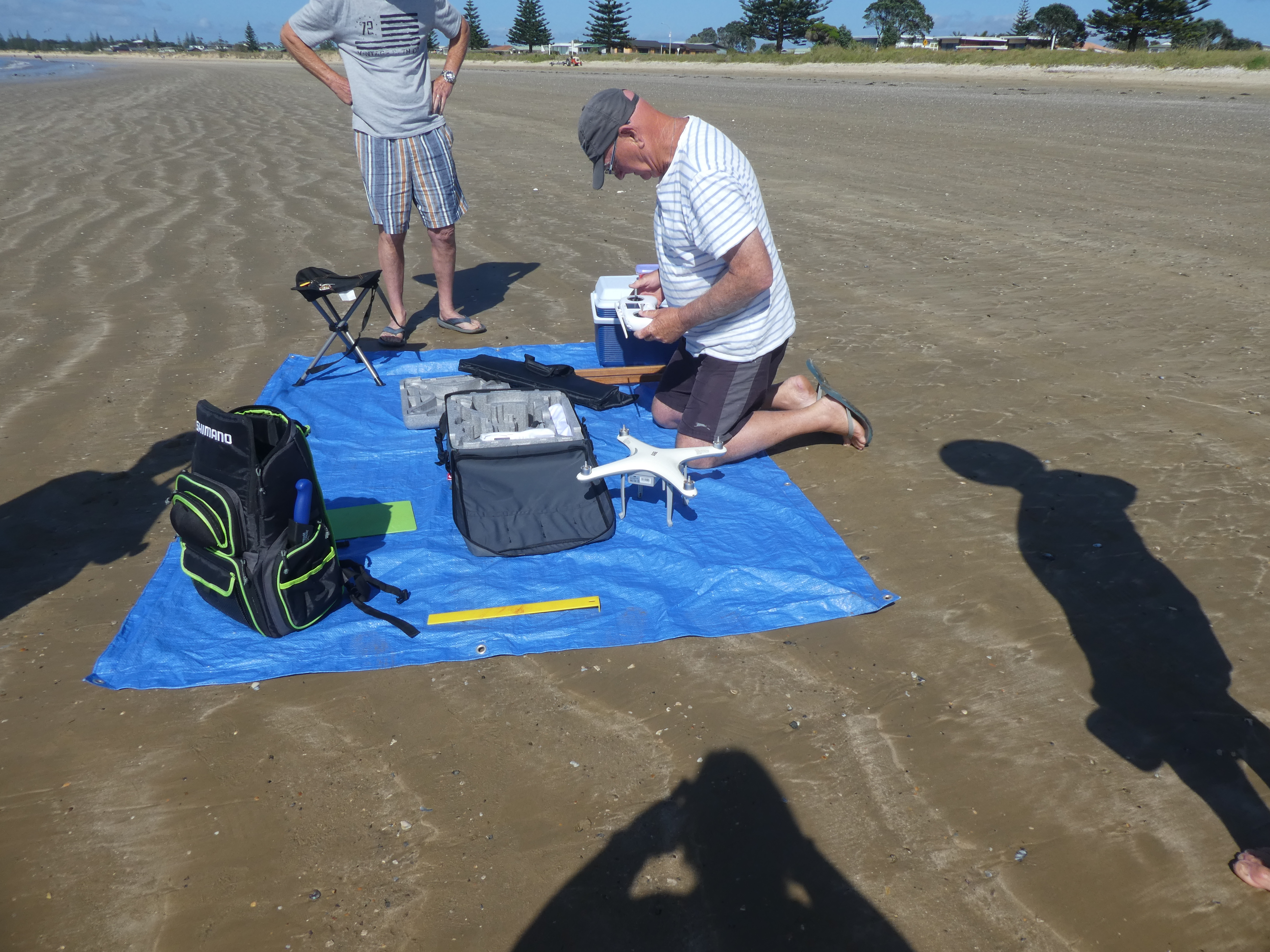 The drone does not handle conditions that are too windy, but the next day was calm and the conditions just right, so we headed off to the beach. It didn’t seem to take long to set up, and Kevin walked round in a circle one way, then the other, holding the drone to his chest, to programme the drone (to let it know where it was).