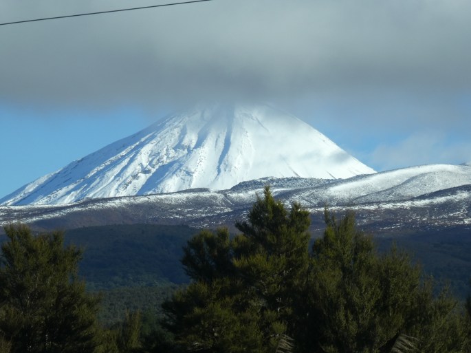 We seem to spend a lot of our trips home trying to beat bad weather and this trip was no exception. We left Paraparaumu on a nice morning and after a quiet night (none of the thunderstorms and hail that we had here last time). We intended to take a different route this time – through the National Park. This would mean a longer trip but with a different view of the mountains. However, as luck would have, by the time we reached the central plateau it was very cloudy and misty, raining at times and any view of any mountains was non-existent. Our view out from the cab of the motorhome was a bit like ground hog day!