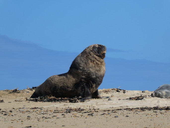 We were just about to go down the path to the beach when this arrogant man approached us and told us it was forbidden to take the dogs on the beach, that we could not go down there. We knew he was wrong because we had carefully checked the DOC  literature before we had taken them out of the van, but his attitude was irritating none the less. However, from the top of the beach we could see an elephant seal and his lady sunning themselves, so we knew the dogs would be better away from here. Bruce took them back up the path and I grabbed some photos.