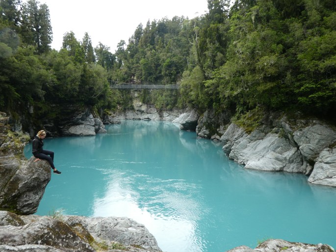 The final stop for the day was to the Blue Pool which it at the meeting of the Blue River to another river (forget the name of it). This was a 1km walk downhill (and 1 km up hill to come back), through bush and the track was well cared for and laid out. The young ones all seemed to know about it because they came prepared with togs and towels. The pool is accessed by a swing bridge and the colour is simply beautiful, but not as azure in colour as the Hokitika Gorge. The blue comes from the light refractive index of the really pure water apparently.